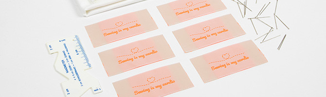 Set of 5 labels in different colours, size 25 x 50 mm.Colour combinations: beige-darkblue, blue-yellow, green-white, blue-lilac, pink-red.With endfolds so easy-to-stitch.